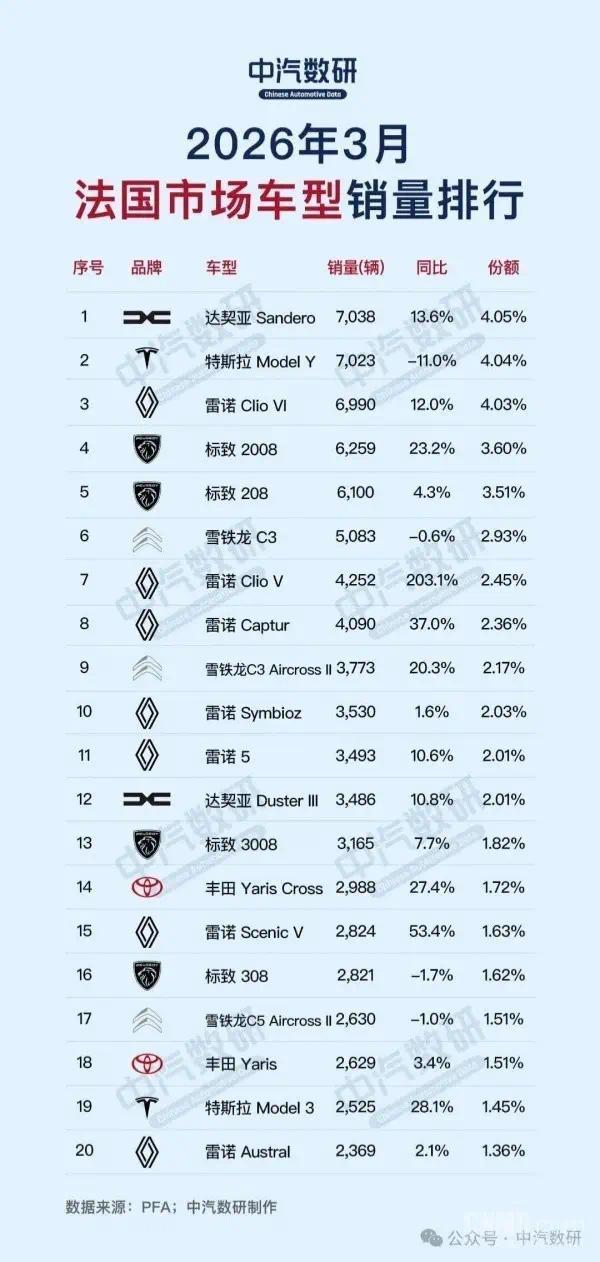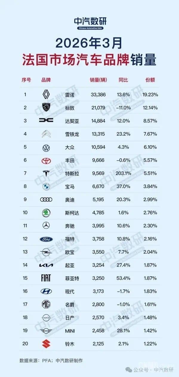 【CNMO科技消息】4月7日,中汽数研发布2026年3月法国汽车品牌/车型销量排行。数据显示,3月法国新车销量17.36万辆,同比增长12.9%;1-3月法国新车累计销量40.16万辆,同比下降2.1%。
